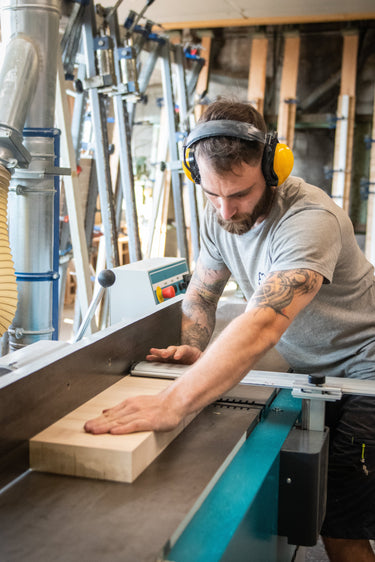 Tout commence dans les forêts du Jura, où nous sélectionnons avec soin les plus beaux charmes, prisés pour leur densité exceptionnelle, supérieure à celle du chêne. Ce bois noble devient ensuite l'expression d'un savoir-faire unique, transmis dans nos ateliers depuis plus d'un siècle. Le bois dit "de bout" est issu d'un sciage perpendiculaire aux fibres du tronc, comme si celui-ci était débité en fines tranches. Ces pavés de bois sont ensuite minutieusement assemblés un à un pour créer une planche à découper artisanale unique.